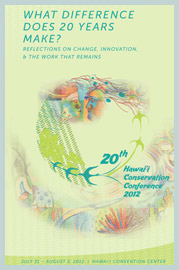 2012 marks the 20th anniversary of the annual Hawai‘i Conservation Conference (HCC) and 20 years since the Rio Earth Summit. The 20th annual conference is an opportunity to reflect on the past two decades of island conservation in Hawai‘i and wider Pacific Islands. Activities will include a presentation of a “20th Anniversary HCC Video” reflecting on the successes and memories of the Hawai‘i Conservation Alliance (formerly the Secretariat for Conservation Biology); daily thought provoking keynote speakers; a special banner to memorialize our collective genealogy; public art event; training opportunities; and more. Join us in celebrating HCC’s 20th anniversary!