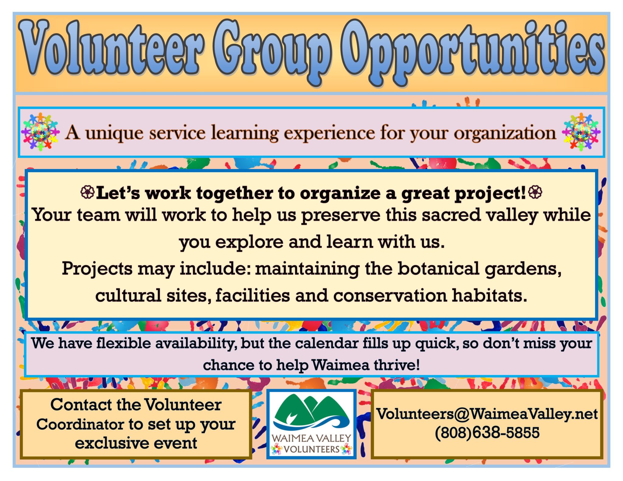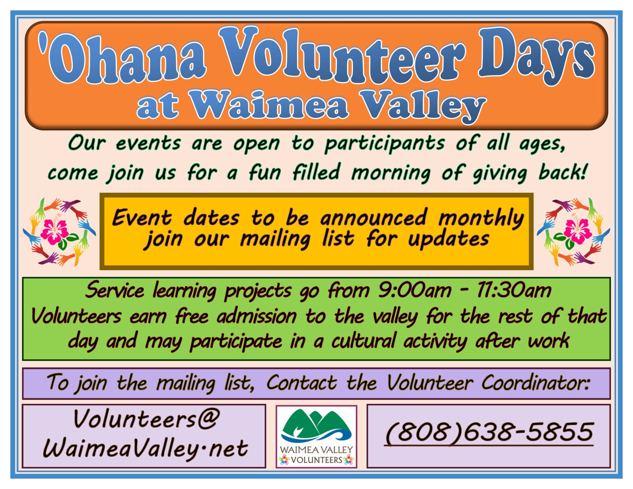 Waimea Valley’s volunteers are an important part of our mission as an organization, not only do they help us do essential work to support the preservation of our cultural sites and knowledge, they also play a big role in our environmental conservation, forest restoration, and botanical garden maintenance. We have opportunities for both groups and individuals to join the volunteer team and help this beautiful valley thrive. There are 3 main ways that volunteers can get involved here, they are: registering for individual volunteer opportunities, joining us for volunteer events, and setting up group projects.