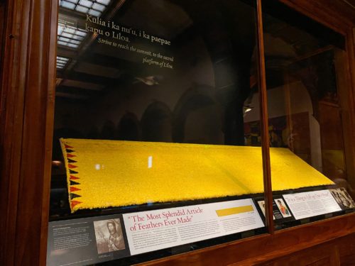 This beautiful pāʻū, or skirt, is the first known example of a feathered garment made for a woman. It was created for Nāhiʻenaʻena, daughter of Kamehameha the Great and high chiefess Keōpūolani, and beloved sister of Liholiho (Kamehameha II) and Kauikeaouli (Kamehameha III). This pāʻū is the single largest piece of Hawaiian featherwork ever made, originally measuring 20 feet long and 30 inches wide.