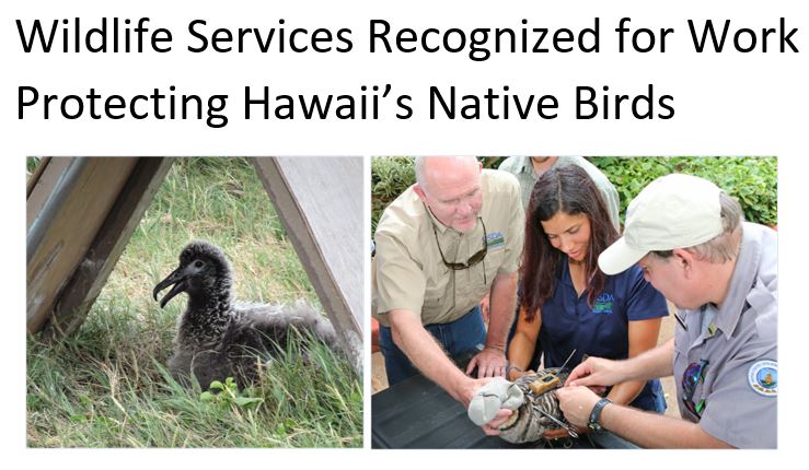 In May, APHIS was awarded the prestigious Presidential Migratory Bird Federal Stewardship Award by the U.S. Fish and Wildlife Service. The recognition is for Wildlife Services (WS) work to protect the Hawaiian goose and Laysan albatross.