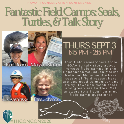 This presentation includes a quick introduction to NOAA’s Protected Species Assessment and Recovery Camps in the Papahānaumokuākea Marine National Monument, followed by an informal Q&A session hosted by real live field researchers. Join us to talk story about our remote field camps where each year NOAA deploys seasonal field researchers to monitor and study Hawaiian monk seals and green sea turtles. Get answers to all your burning field camp questions, such as what is like living in a tent for 4 months with one other teammate on the island? What is a normal day conducting field work like? How do you do dishes and laundry? What really is a longdrop? And, this sounds like an amazing experience – how do I apply?! We’re here to answer all your questions and more!
