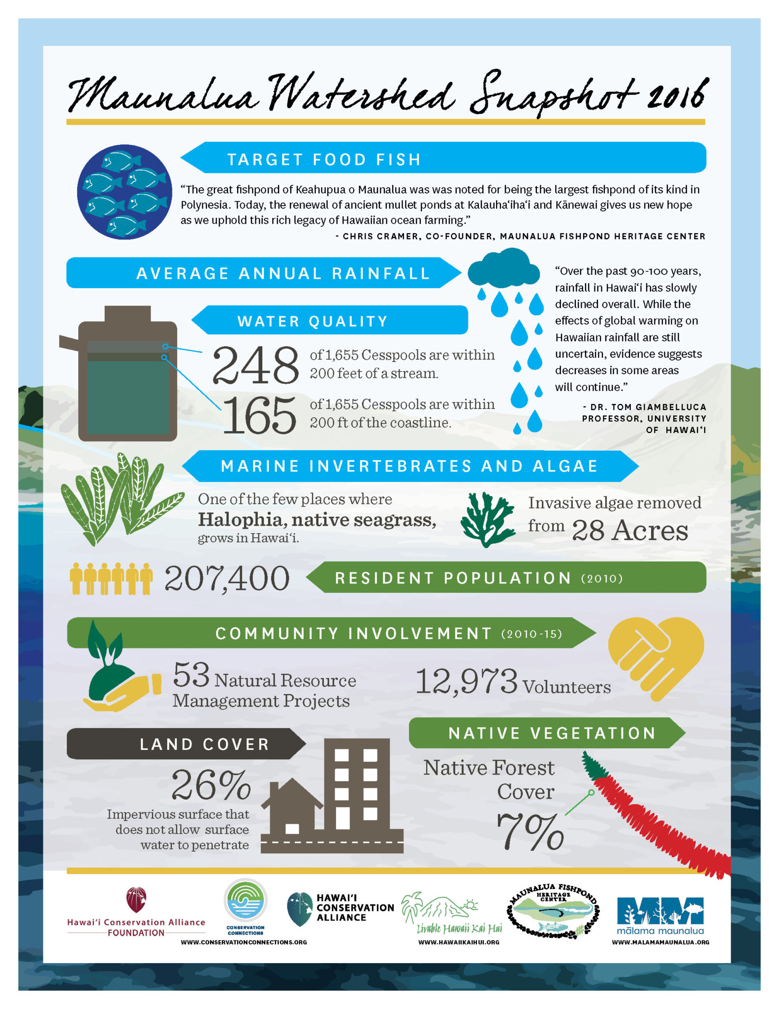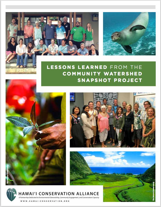 The Hawaiʻi Conservation Alliance Watershed Snapshot is a status report on the health of our watersheds for decision makers and communities. The analysis uses geospatial data and select information gathered by participating communities to inform development of a suite of communication tools to advance coastal management efforts.
